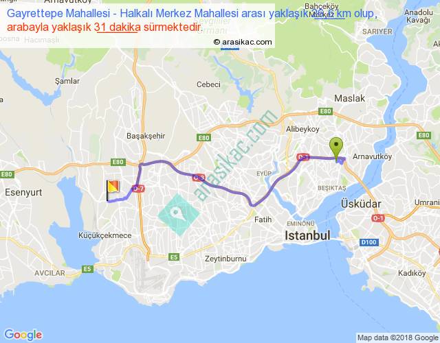 Gayrettepe Mahallesi - Halkalı Merkez Mahallesi arası yaklaşık olarak 90 km/h ile yukarıda belirtilen sürede olup, iki yerin kuş uçuşu uzaklığı (mesafesi) 19'dir. Yolculuk otobüsle 40 dakika sürmektedir.