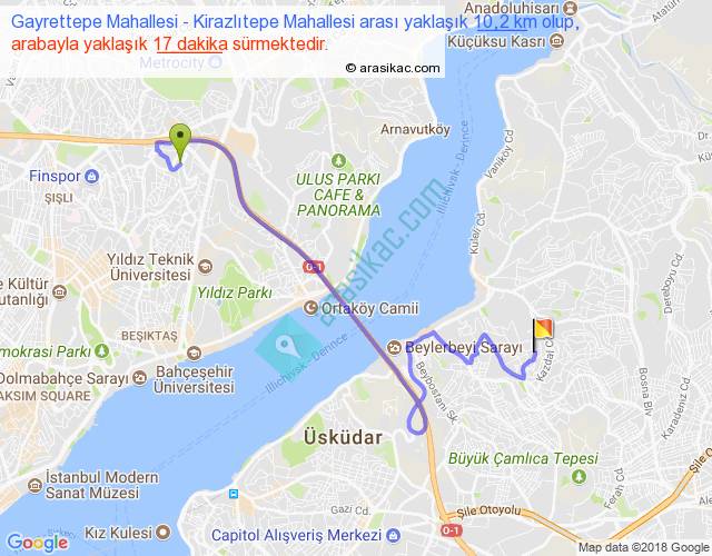 Gayrettepe Mahallesi - Kirazlıtepe Mahallesi arası yaklaşık olarak 90 km/h ile yukarıda belirtilen sürede olup, iki yerin kuş uçuşu uzaklığı (mesafesi) 5'dir. Yolculuk otobüsle 22 dakika sürmektedir.