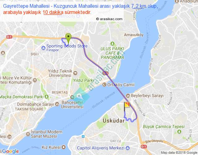 Gayrettepe Mahallesi - Kuzguncuk Mahallesi arası yaklaşık olarak 90 km/h ile yukarıda belirtilen sürede olup, iki yerin kuş uçuşu uzaklığı (mesafesi) 4'dir. Yolculuk otobüsle 13 dakika sürmektedir.