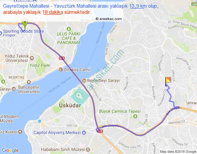 Gayrettepe Mahallesi - Yavuztürk Mahallesi arası yaklaşık olarak 90 km/h ile yukarıda belirtilen sürede olup, iki yerin kuş uçuşu uzaklığı (mesafesi) 7'dir. Yolculuk otobüsle 23 dakika sürmektedir.