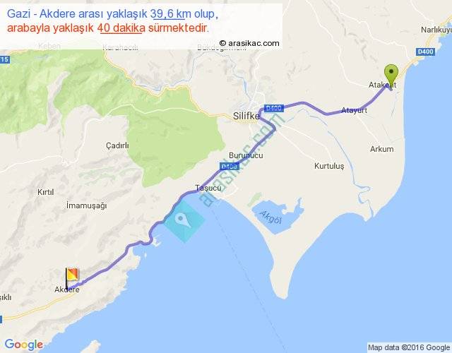 Gazi - Akdere arası yaklaşık olarak 90 km/h ile yukarıda belirtilen sürede olup, iki yerin kuş uçuşu uzaklığı (mesafesi) 33'dir. Yolculuk otobüsle 52 dakika sürmektedir.