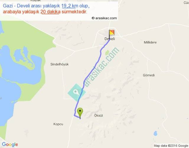 Gazi - Develi arası yaklaşık olarak 90 km/h ile yukarıda belirtilen sürede olup, iki yerin kuş uçuşu uzaklığı (mesafesi) 17'dir. Yolculuk otobüsle 26 dakika sürmektedir.