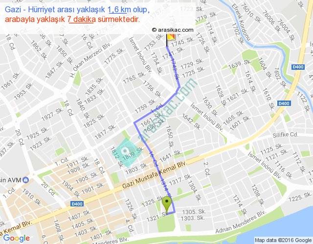Gazi - Hürriyet arası yaklaşık olarak 90 km/h ile yukarıda belirtilen sürede olup, iki yerin kuş uçuşu uzaklığı (mesafesi) 1'dir. Yolculuk otobüsle 9 dakika sürmektedir.