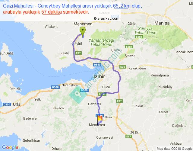 Gazi Mahallesi - Cüneytbey Mahallesi arası yaklaşık olarak 90 km/h ile yukarıda belirtilen sürede olup, iki yerin kuş uçuşu uzaklığı (mesafesi) 35'dir. Yolculuk otobüsle 1 saat 14 dakika sürmektedir.