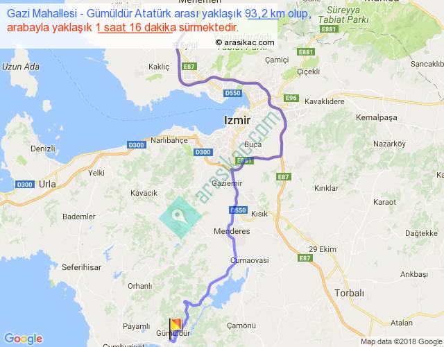 Gazi Mahallesi - Gümüldür Atatürk arası yaklaşık olarak 90 km/h ile yukarıda belirtilen sürede olup, iki yerin kuş uçuşu uzaklığı (mesafesi) 53'dir. Yolculuk otobüsle 1 saat 38 dakika sürmektedir.