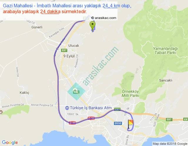 Gazi Mahallesi - İmbatlı Mahallesi arası yaklaşık olarak 90 km/h ile yukarıda belirtilen sürede olup, iki yerin kuş uçuşu uzaklığı (mesafesi) 11'dir. Yolculuk otobüsle 31 dakika sürmektedir.