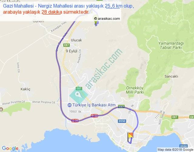 Gazi Mahallesi - Nergiz Mahallesi arası yaklaşık olarak 90 km/h ile yukarıda belirtilen sürede olup, iki yerin kuş uçuşu uzaklığı (mesafesi) 12'dir. Yolculuk otobüsle 36 dakika sürmektedir.
