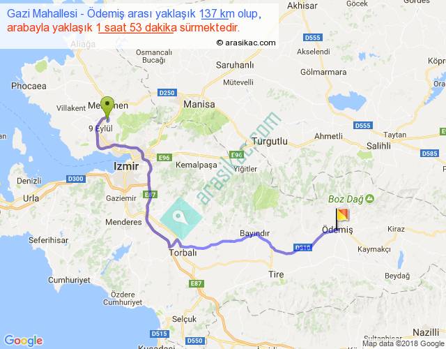 Gazi Mahallesi - Ödemiş arası yaklaşık olarak 90 km/h ile yukarıda belirtilen sürede olup, iki yerin kuş uçuşu uzaklığı (mesafesi) 87'dir. Yolculuk otobüsle 2 saat 26 dakika sürmektedir.