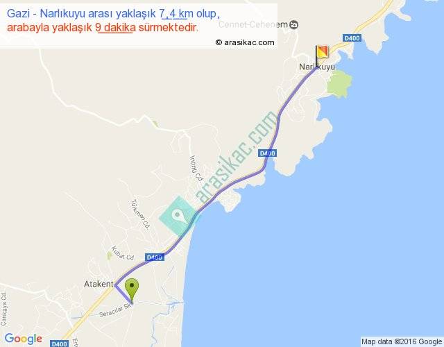 Gazi - Narlıkuyu arası yaklaşık olarak 90 km/h ile yukarıda belirtilen sürede olup, iki yerin kuş uçuşu uzaklığı (mesafesi) 7'dir. Yolculuk otobüsle 11 dakika sürmektedir.