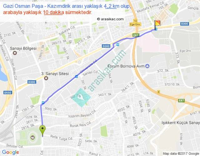 Gazi Osman Paşa - Kazımdirik arası yaklaşık olarak 90 km/h ile yukarıda belirtilen sürede olup, iki yerin kuş uçuşu uzaklığı (mesafesi) 4'dir. Yolculuk otobüsle 13 dakika sürmektedir.