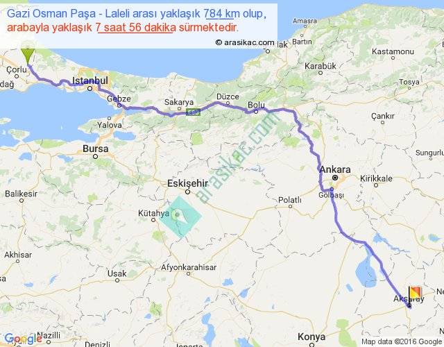 Gazi Osman Paşa - Laleli arası yaklaşık olarak 90 km/h ile yukarıda belirtilen sürede olup, iki yerin kuş uçuşu uzaklığı (mesafesi) 608'dir. Eğer belirtilen yerler arasında uçak seferi var ise bu süre uçakla 56 dakika'ya kadar düşebilir. Yolculuk otobüsle 10 saat 18 dakika sürmektedir.