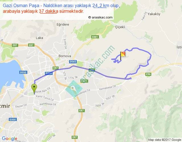 Gazi Osman Paşa - Naldöken arası yaklaşık olarak 90 km/h ile yukarıda belirtilen sürede olup, iki yerin kuş uçuşu uzaklığı (mesafesi) 10'dir. Yolculuk otobüsle 48 dakika sürmektedir.