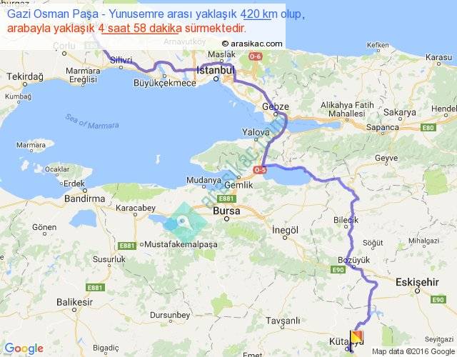 Gazi Osman Paşa - Yunusemre arası yaklaşık olarak 90 km/h ile yukarıda belirtilen sürede olup, iki yerin kuş uçuşu uzaklığı (mesafesi) 269'dir. Eğer belirtilen yerler arasında uçak seferi var ise bu süre uçakla 24 dakika'ya kadar düşebilir. Yolculuk otobüsle 6 saat 27 dakika sürmektedir.