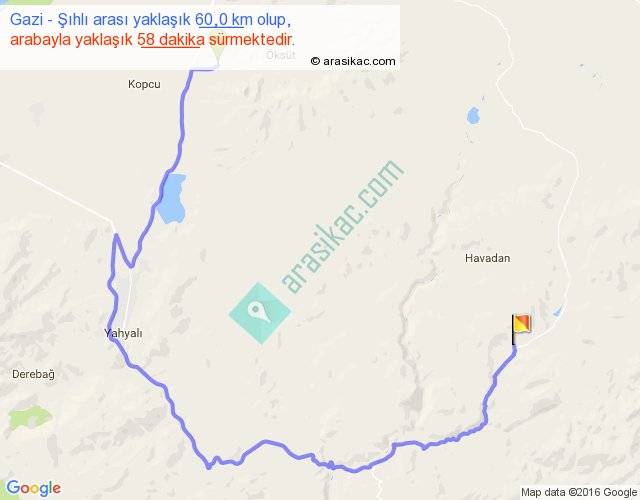 Gazi - Şıhlı arası yaklaşık olarak 90 km/h ile yukarıda belirtilen sürede olup, iki yerin kuş uçuşu uzaklığı (mesafesi) 24'dir. Yolculuk otobüsle 1 saat 15 dakika sürmektedir.