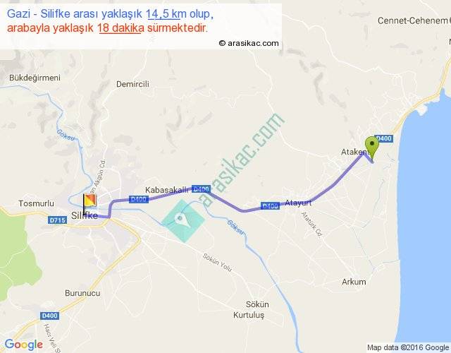 Gazi - Silifke arası yaklaşık olarak 90 km/h ile yukarıda belirtilen sürede olup, iki yerin kuş uçuşu uzaklığı (mesafesi) 13'dir. Yolculuk otobüsle 23 dakika sürmektedir.