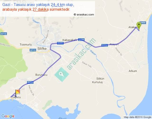 Gazi - Tasucu arası yaklaşık olarak 90 km/h ile yukarıda belirtilen sürede olup, iki yerin kuş uçuşu uzaklığı (mesafesi) 18'dir. Yolculuk otobüsle 35 dakika sürmektedir.