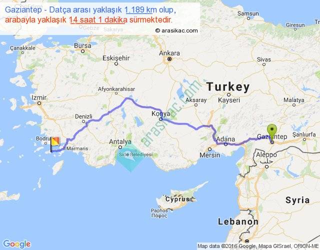 Gaziantep - Datça arası yaklaşık olarak 90 km/h ile yukarıda belirtilen sürede olup, iki yerin kuş uçuşu uzaklığı (mesafesi) 857'dir. Eğer belirtilen yerler arasında uçak seferi var ise bu süre uçakla 1 saat 19 dakika'ya kadar düşebilir. Yolculuk otobüsle 18 saat 13 dakika sürmektedir.