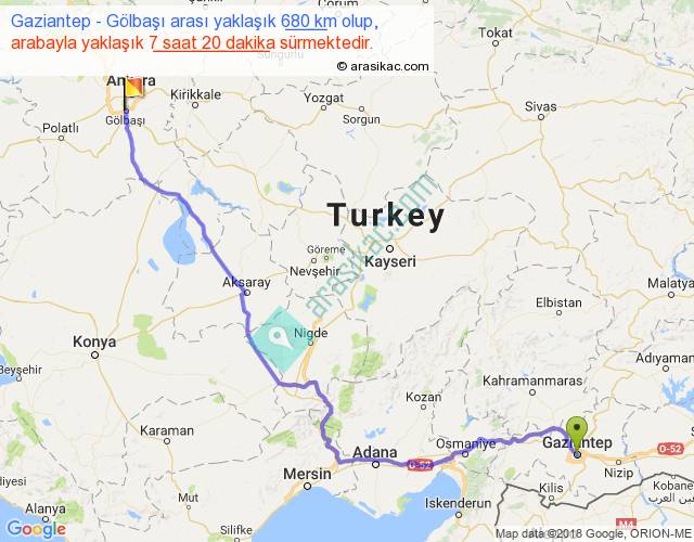 Gaziantep - Gölbaşı arası yaklaşık olarak 90 km/h ile yukarıda belirtilen sürede olup, iki yerin kuş uçuşu uzaklığı (mesafesi) 498'dir. Eğer belirtilen yerler arasında uçak seferi var ise bu süre uçakla 45 dakika'ya kadar düşebilir. Yolculuk otobüsle 9 saat 43 dakika sürmektedir.