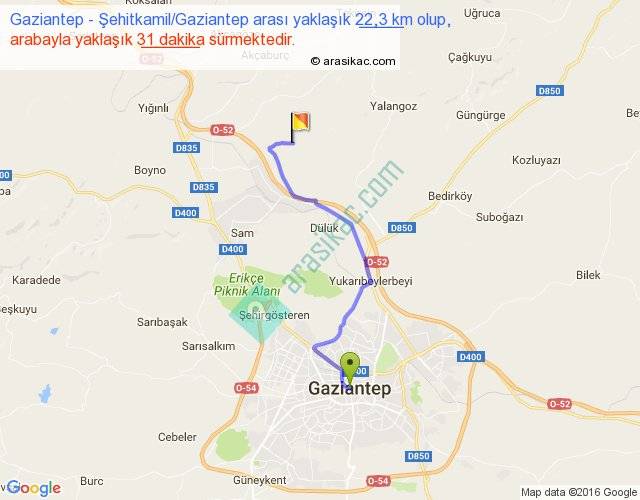 Gaziantep - Şehitkamil Gaziantep arası yaklaşık olarak 90 km/h ile yukarıda belirtilen sürede olup, iki yerin kuş uçuşu uzaklığı (mesafesi) 15'dir. Yolculuk otobüsle 40 dakika sürmektedir.