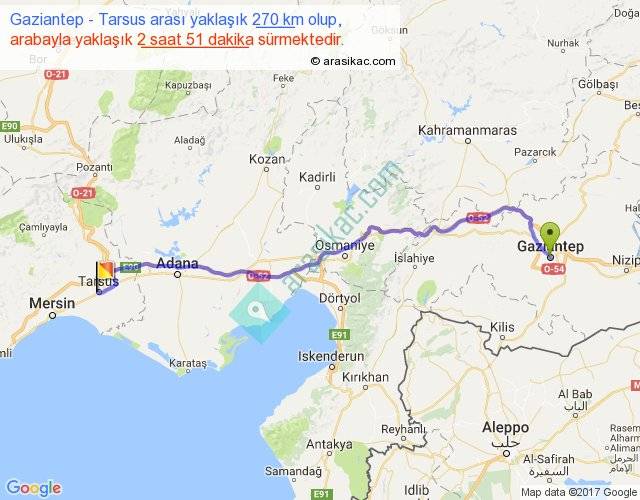 Gaziantep - Tarsus arası yaklaşık olarak 90 km/h ile yukarıda belirtilen sürede olup, iki yerin kuş uçuşu uzaklığı (mesafesi) 220'dir. Yolculuk otobüsle 3 saat 42 dakika sürmektedir.