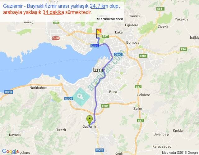 Gaziemir - Bayraklı İzmir arası yaklaşık olarak 90 km/h ile yukarıda belirtilen sürede olup, iki yerin kuş uçuşu uzaklığı (mesafesi) 17'dir. Yolculuk otobüsle 44 dakika sürmektedir.