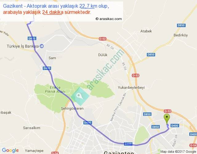 Gazikent - Aktoprak arası yaklaşık olarak 90 km/h ile yukarıda belirtilen sürede olup, iki yerin kuş uçuşu uzaklığı (mesafesi) 17'dir. Yolculuk otobüsle 31 dakika sürmektedir.