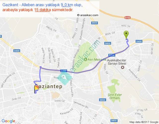 Gazikent - Alleben arası yaklaşık olarak 90 km/h ile yukarıda belirtilen sürede olup, iki yerin kuş uçuşu uzaklığı (mesafesi) 6'dir. Yolculuk otobüsle 19 dakika sürmektedir.