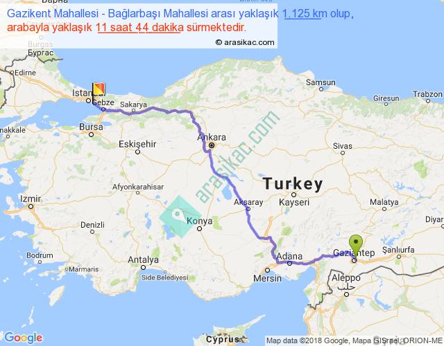 Gazikent Mahallesi - Bağlarbaşı Mahallesi arası yaklaşık olarak 90 km/h ile yukarıda belirtilen sürede olup, iki yerin kuş uçuşu uzaklığı (mesafesi) 828'dir. Eğer belirtilen yerler arasında uçak seferi var ise bu süre uçakla 1 saat 16 dakika'ya kadar düşebilir. Yolculuk otobüsle 15 saat 15 dakika sürmektedir.
