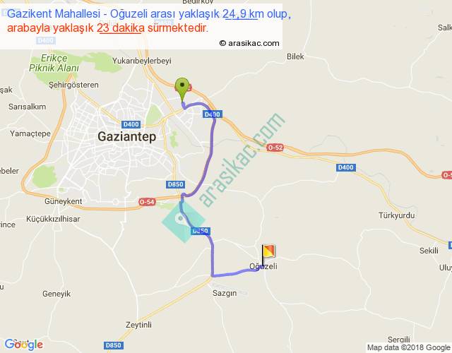 Gazikent Mahallesi - Oğuzeli arası yaklaşık olarak 90 km/h ile yukarıda belirtilen sürede olup, iki yerin kuş uçuşu uzaklığı (mesafesi) 16'dir. Yolculuk otobüsle 29 dakika sürmektedir.