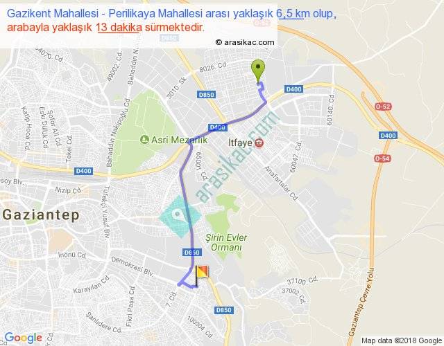 Gazikent Mahallesi - Perilikaya Mahallesi arası yaklaşık olarak 90 km/h ile yukarıda belirtilen sürede olup, iki yerin kuş uçuşu uzaklığı (mesafesi) 5'dir. Yolculuk otobüsle 16 dakika sürmektedir.