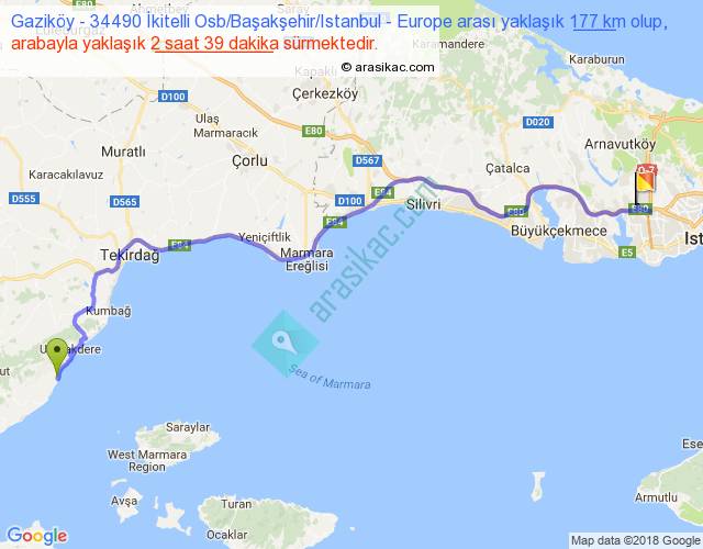 Gaziköy - 34490 İkitelli Osb Başakşehir Istanbul - Europe arası yaklaşık olarak 90 km/h ile yukarıda belirtilen sürede olup, iki yerin kuş uçuşu uzaklığı (mesafesi) 127'dir. Yolculuk otobüsle 3 saat 26 dakika sürmektedir.