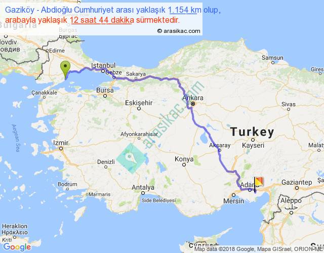 Gaziköy - Abdioğlu Cumhuriyet arası yaklaşık olarak 90 km/h ile yukarıda belirtilen sürede olup, iki yerin kuş uçuşu uzaklığı (mesafesi) 826'dir. Eğer belirtilen yerler arasında uçak seferi var ise bu süre uçakla 1 saat 16 dakika'ya kadar düşebilir. Yolculuk otobüsle 16 saat 33 dakika sürmektedir.