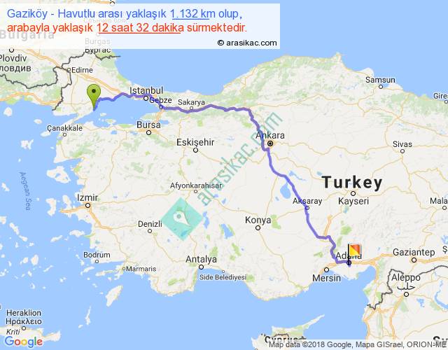 Gaziköy - Havutlu arası yaklaşık olarak 90 km/h ile yukarıda belirtilen sürede olup, iki yerin kuş uçuşu uzaklığı (mesafesi) 808'dir. Eğer belirtilen yerler arasında uçak seferi var ise bu süre uçakla 1 saat 14 dakika'ya kadar düşebilir. Yolculuk otobüsle 16 saat 17 dakika sürmektedir.
