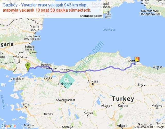 Gaziköy - Yavuzlar arası yaklaşık olarak 90 km/h ile yukarıda belirtilen sürede olup, iki yerin kuş uçuşu uzaklığı (mesafesi) 764'dir. Eğer belirtilen yerler arasında uçak seferi var ise bu süre uçakla 1 saat 10 dakika'ya kadar düşebilir. Yolculuk otobüsle 14 saat 15 dakika sürmektedir.