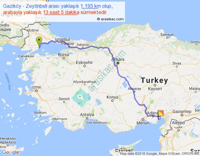 Gaziköy - Zeytinbeli arası yaklaşık olarak 90 km/h ile yukarıda belirtilen sürede olup, iki yerin kuş uçuşu uzaklığı (mesafesi) 844'dir. Eğer belirtilen yerler arasında uçak seferi var ise bu süre uçakla 1 saat 17 dakika'ya kadar düşebilir. Yolculuk otobüsle 17 saat 0 dakika sürmektedir.