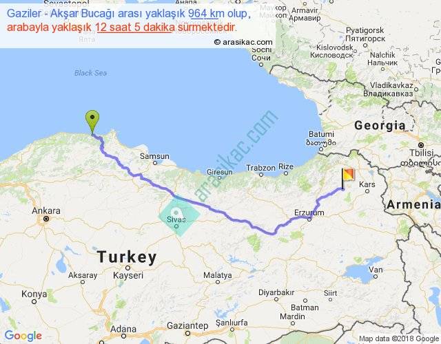 Gaziler - Akşar Bucağı arası yaklaşık olarak 90 km/h ile yukarıda belirtilen sürede olup, iki yerin kuş uçuşu uzaklığı (mesafesi) 680'dir. Eğer belirtilen yerler arasında uçak seferi var ise bu süre uçakla 1 saat 02 dakika'ya kadar düşebilir. Yolculuk otobüsle 15 saat 42 dakika sürmektedir.