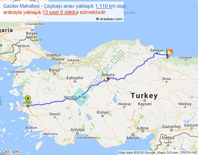 Gaziler Mahallesi - Çaybaşı arası yaklaşık olarak 90 km/h ile yukarıda belirtilen sürede olup, iki yerin kuş uçuşu uzaklığı (mesafesi) 891'dir. Eğer belirtilen yerler arasında uçak seferi var ise bu süre uçakla 1 saat 22 dakika'ya kadar düşebilir. Yolculuk otobüsle 17 saat 1 dakika sürmektedir.