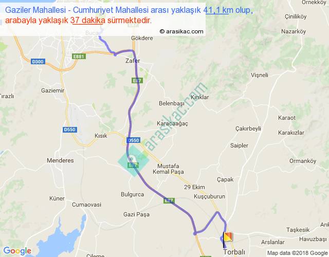 Gaziler Mahallesi - Cumhuriyet Mahallesi arası yaklaşık olarak 90 km/h ile yukarıda belirtilen sürede olup, iki yerin kuş uçuşu uzaklığı (mesafesi) 29'dir. Yolculuk otobüsle 48 dakika sürmektedir.