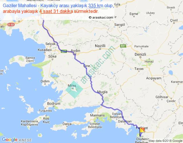 Gaziler Mahallesi - Kayaköy arası yaklaşık olarak 90 km/h ile yukarıda belirtilen sürede olup, iki yerin kuş uçuşu uzaklığı (mesafesi) 261'dir. Eğer belirtilen yerler arasında uçak seferi var ise bu süre uçakla 24 dakika'ya kadar düşebilir. Yolculuk otobüsle 5 saat 52 dakika sürmektedir.