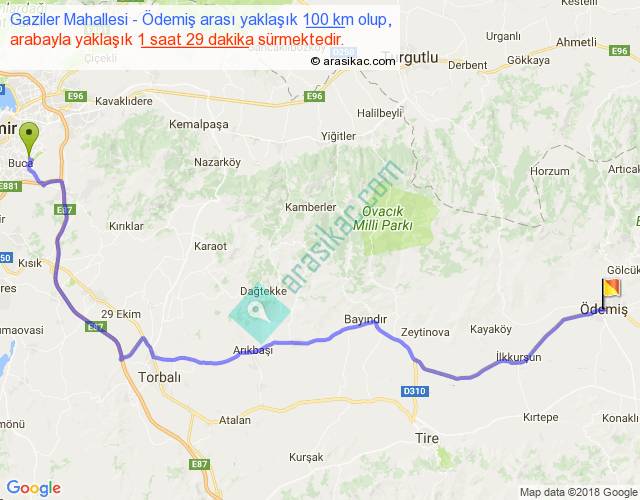 Gaziler Mahallesi - Ödemiş arası yaklaşık olarak 90 km/h ile yukarıda belirtilen sürede olup, iki yerin kuş uçuşu uzaklığı (mesafesi) 71'dir. Yolculuk otobüsle 1 saat 55 dakika sürmektedir.
