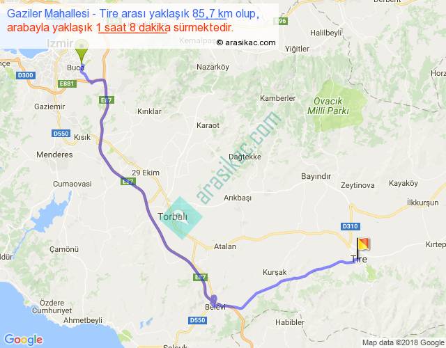 Gaziler Mahallesi - Tire arası yaklaşık olarak 90 km/h ile yukarıda belirtilen sürede olup, iki yerin kuş uçuşu uzaklığı (mesafesi) 58'dir. Yolculuk otobüsle 1 saat 28 dakika sürmektedir.