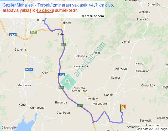 Gaziler Mahallesi - Torbalı İzmir arası yaklaşık olarak 90 km/h ile yukarıda belirtilen sürede olup, iki yerin kuş uçuşu uzaklığı (mesafesi) 28'dir. Yolculuk otobüsle 55 dakika sürmektedir.