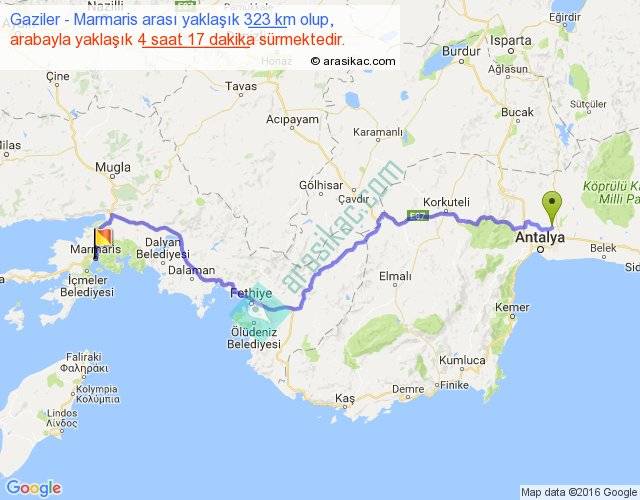 Gaziler - Marmaris arası yaklaşık olarak 90 km/h ile yukarıda belirtilen sürede olup, iki yerin kuş uçuşu uzaklığı (mesafesi) 222'dir. Yolculuk otobüsle 5 saat 34 dakika sürmektedir.