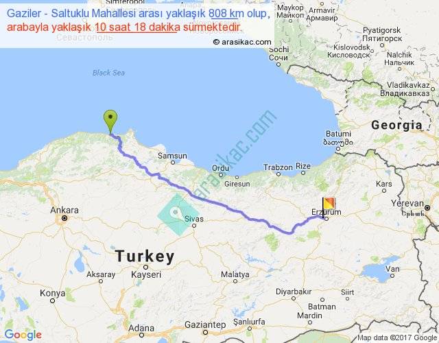 Gaziler - Saltuklu Mahallesi arası yaklaşık olarak 90 km/h ile yukarıda belirtilen sürede olup, iki yerin kuş uçuşu uzaklığı (mesafesi) 613'dir. Eğer belirtilen yerler arasında uçak seferi var ise bu süre uçakla 56 dakika'ya kadar düşebilir. Yolculuk otobüsle 13 saat 23 dakika sürmektedir.