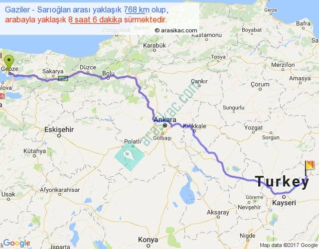 Gaziler - Sarıoğlan arası yaklaşık olarak 90 km/h ile yukarıda belirtilen sürede olup, iki yerin kuş uçuşu uzaklığı (mesafesi) 21'dir. Yolculuk otobüsle 44 dakika sürmektedir.