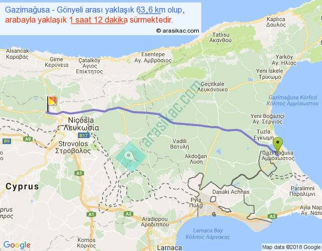 Gazimağusa - Gönyeli arası yaklaşık olarak 90 km/h ile yukarıda belirtilen sürede olup, iki yerin kuş uçuşu uzaklığı (mesafesi) 58'dir. Yolculuk otobüsle 1 saat 33 dakika sürmektedir.