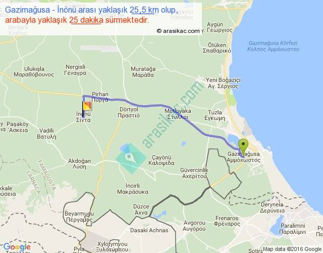 Gazimağusa - İnönü arası yaklaşık olarak 90 km/h ile yukarıda belirtilen sürede olup, iki yerin kuş uçuşu uzaklığı (mesafesi) 20'dir. Yolculuk otobüsle 32 dakika sürmektedir.
