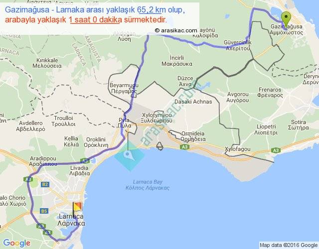 Gazimağusa - Larnaka arası yaklaşık olarak 90 km/h ile yukarıda belirtilen sürede olup, iki yerin kuş uçuşu uzaklığı (mesafesi) 35'dir. Yolculuk otobüsle 1 saat 18 dakika sürmektedir.
