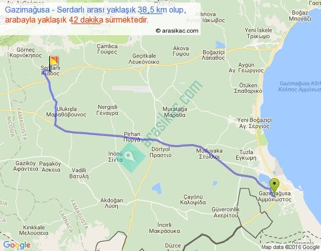 Gazimağusa - Serdarlı arası yaklaşık olarak 90 km/h ile yukarıda belirtilen sürede olup, iki yerin kuş uçuşu uzaklığı (mesafesi) 32'dir. Yolculuk otobüsle 54 dakika sürmektedir.