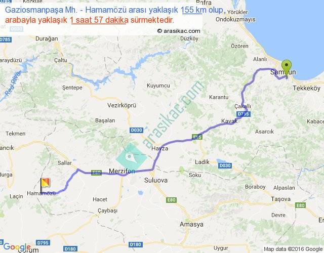 Gaziosmanpaşa Mh. - Hamamözü arası yaklaşık olarak 90 km/h ile yukarıda belirtilen sürede olup, iki yerin kuş uçuşu uzaklığı (mesafesi) 123'dir. Yolculuk otobüsle 2 saat 32 dakika sürmektedir.